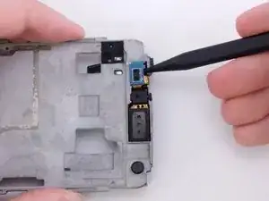 Поднимите лопаточку от опорной пластины, чтобы извлечь компонент разъёма для наушников.