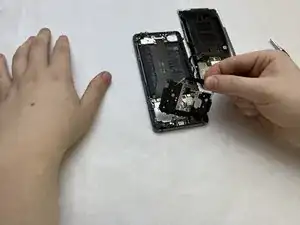 С помощью пинцета снимите металлический щит, закрывающий разъем датчика отпечатков.