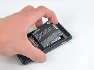 Схватите верхний левый угол аккумулятора и вытащите его из посадочного места.
