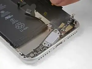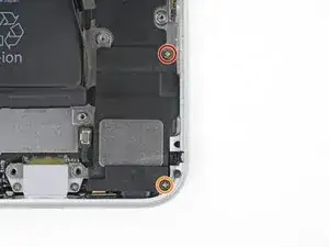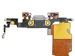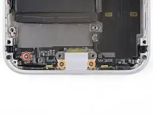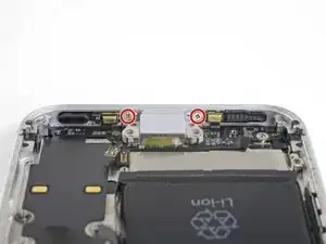 Удалите два винта Phillips 1,4 мм, фиксирующие порт Lightning к нижнему краю телефона.