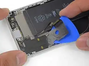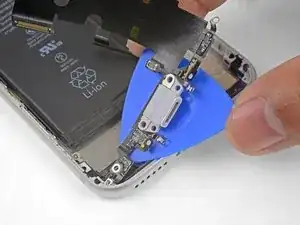 Используйте острый конец лопатки, чтобы приподнять и отсоединить кабель разъёма Lightning от платы.