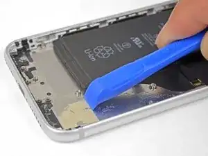 Просуньте медиатор под разъём Lightning, чтобы дальше отделить сборку от задней крышки.