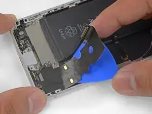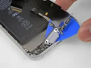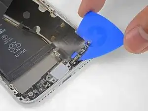 Просуньте медиатор под верхнюю часть гибкого кабеля сборки разъёма Lightning и начните отделять кабель от задней крышки.