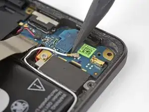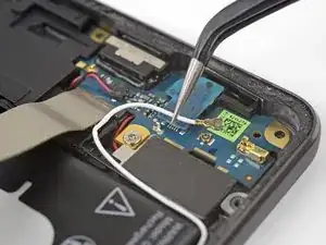 Используйте пинцет, чтобы тянуть белый антенный кабель прямо вверх и вытащить его из металлических зажимов на плате и из канала на громкоговорителе.