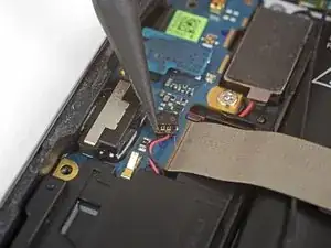 Используйте острый конец лопатки, чтобы приподнять разъём шлейфа дисплея и вывести его из гнезда на материнской плате.