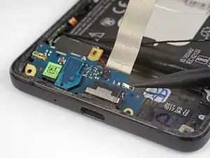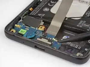 Убедитесь, что мотор вибрации не приклеен к телефону, затем аккуратно выньте плату зарядного узла из телефона, одновременно подняв мотор.