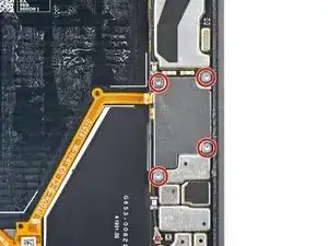 Снимите четыре винта Torx T3, удерживающие экранную защиту разъёма аккумулятора: