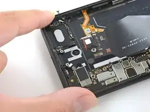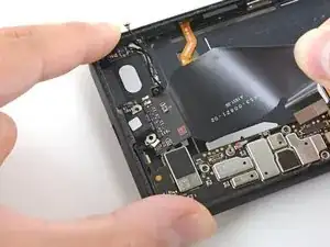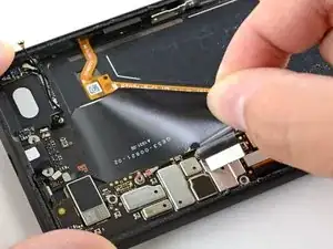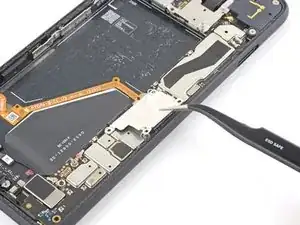 Отогните ленточный кабель, закреплённый на рамке телефона. Он приклеен лёгким слоем клея.
