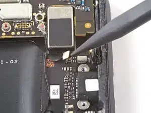 Используя заострённый конец лопатки, отключите разъём кабеля зарядки, поддев его строго вверх от материнской платы.
