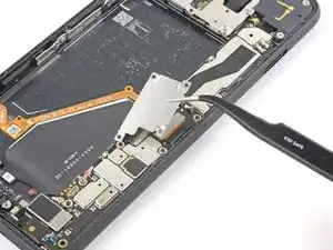С помощью пинцета снимите защитную пластину разъёма аккумулятора.