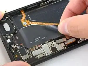 Аккумулятор зафиксирован тремя отдельными растягивающимися клеевыми лентами, которые соединены одним чёрным вытяжным язычком. Вы можете попытаться вытянуть все три ленты одновременно, но проще разрезать чёрный язычок в месте выемки и вытягивать каждую ленту по отдельности.