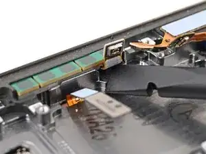 Используйте лопатку, чтобы приподнять и отсоединить пресс‑разъём кабеля дисплея от материнской платы.