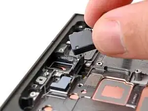 Используйте лопатку, чтобы осторожно приподнять угол язычка катушки беспроводной зарядки, приклеенного к правому краю рамки.