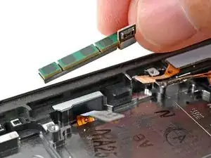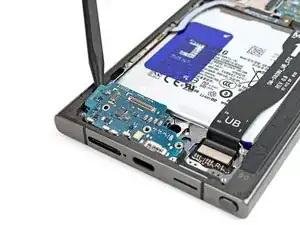 При повторной сборке вставьте порт USB‑C в его выемку под углом, прежде чем прижать дополнительную плату к рамке.