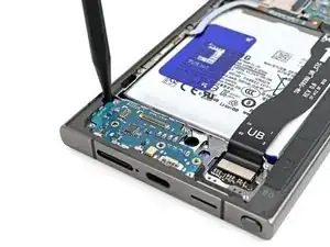 Используйте лопатку, чтобы поддеть и отсоединить нажимной разъём порта стилуса от платы.