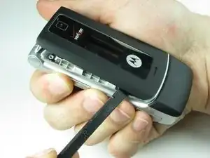 С использованием плоского конца лопатки, вставьте ее под пластик в верхнем левом углу телефона.