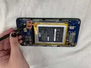С помощью лопатки отсоедините золотой шлейф, идущий от аккумулятора к верхней плате.