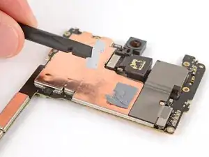 Вставьте острый конец лопатки под отверстие для винта вблизи камер и приподнимите плату, пока не сможете захватить её пальцами.