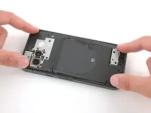 Используйте острый наконечник лопатки, чтобы поддеть и отщёлкнуть узел беспроводной зарядки из двух вырезов — одного справа от порта зарядки и другого на левой кромке чуть ниже камеры.