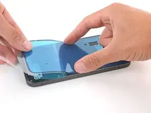 Сложив большую прозрачную подложку в сторону нижней части телефона, уложите открытую верхнюю кромку клея на рамку.