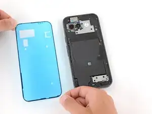 Держите клей над рамкой, чтобы определить его ориентацию. Используйте вырез для камеры на подложке, чтобы визуализировать его положение на рамке.