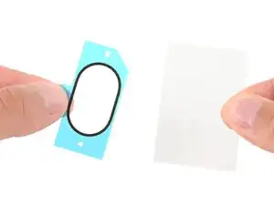 Снимите большую прозрачную защитную плёнку с клеевого слоя внутренней рамки и разместите его вокруг отверстий для камер.