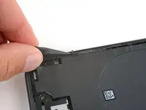 Проведите монтажной лопаткой вверх по правому краю, вокруг правого верхнего угла и вдоль верхнего края, чтобы отделить клей, фиксирующий заднюю крышку.