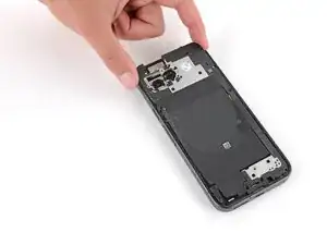 Толкните плату вниз по направлению к нижней части рамки и нажмите на порт зарядки, пока он не защёлкнется в вырезе.