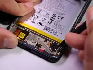 С помощью пластмассовой лопатки подденьте вибромотор, начиная с верхнего правого края. Мотор приклеен, поэтому может потребоваться некоторое усилие.