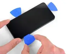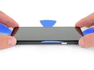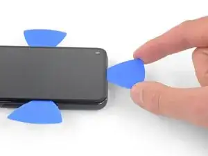 Вставьте ещё одну монтажную лопатку в нижний край телефона под углом в месте, где уже образовался зазор, чтобы не повредить OLED-панель.