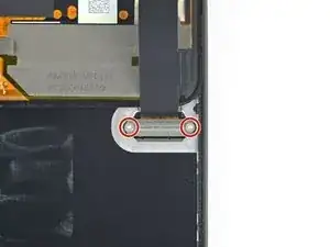 Отвёрткой Torx T3 выкрутите два винта длиной 2,1 мм, фиксирующие кронштейн разъема экрана.