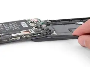 Используйте кончик медиатора, чтобы отсоединить кабель динамика от платы.