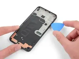 На фото показаны компоненты средней рамки за задней крышкой. Обратите внимание на пружинные контакты возле кромки средней рамки. При разрезании шва медиатором в следующем шаге не вставляйте медиатор глубже, чем на 2 мм, чтобы не повредить пружинные контакты.
