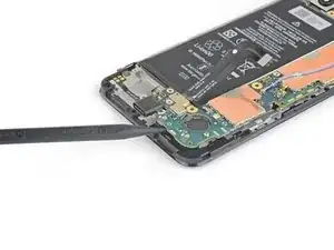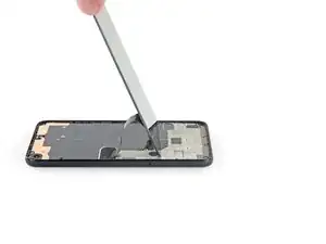 Вставьте ещё одну монтажную лопатку в левый край телефона под углом в месте, где уже образовался зазор, чтобы не повредить OLED-панель.