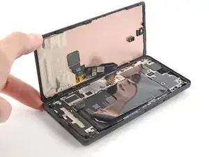 На данном этапе экран должен быть отделен от рамки. Если все еще ощущается сопротивление по краям экрана, используйте открывающую лопатку, чтобы освободить оставшиеся зажимы.