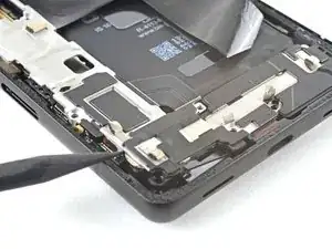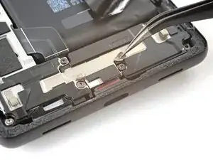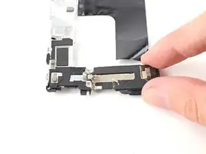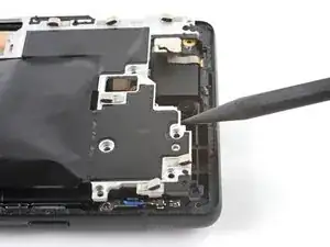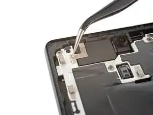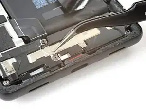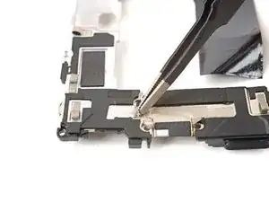 Используйте пинцет, чтобы отогнуть серебряную ленту, соединяющую среднюю рамку и верхний динамик.