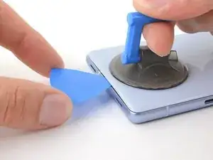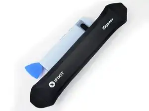 Вставьте пятую лопатку в верхний левый угол задней крышки на глубину от 8 до 10 мм (0,3–0,4 дюйма), или чуть больше половины расстояния от конца лопатки до логотипа iFixit.