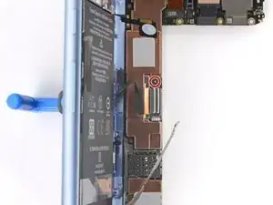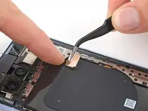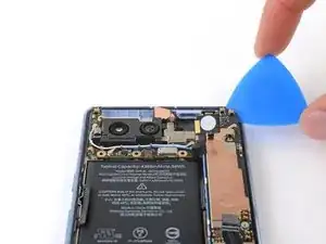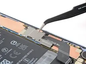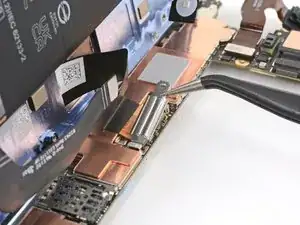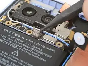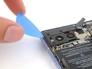 Воспользуйтесь остриём лопатки или ногтем, чтобы приподнять и отключить шлейф с защёлкой чуть выше аккумулятора.