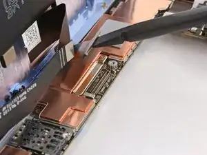 Воспользуйтесь плоским концом лопатки, чтобы приподнять и отключить шлейф экрана с защёлкой.