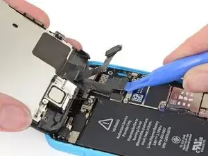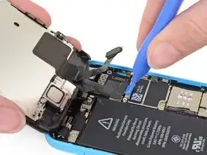 Используйте пластиковый инструмент для вскрытия или ноготь, чтобы отключить разъём кабеля фронтальной камеры и датчиков.