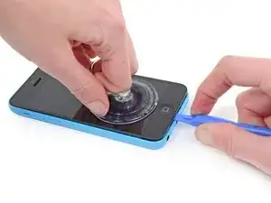 Пластиковым инструментом для вскрытия начните аккуратно поддевать заднюю крышку вниз, отводя её от сборки дисплея, пока вы тянете вверх за присоску.