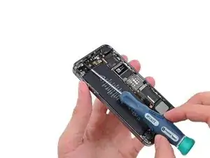 Снимите металлическую скобу разъёма аккумулятора с iPhone.