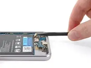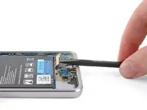 Используйте лопатку, чтобы приподнять защёлкивающий разъём на конце гибкого кабеля аккумулятора, отсоединив аккумулятор.