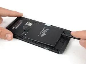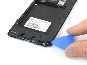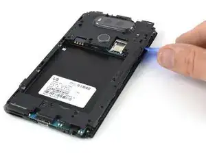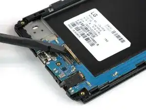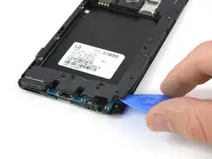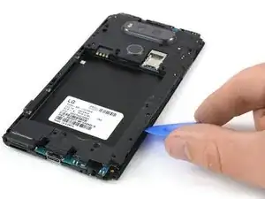 Используйте медиатор, чтобы поддеть крышку материнской платы в правом нижнем углу телефона, пока она не выйдет из пластиковой защёлки.