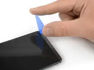 Проведите медиатором вдоль средней рамки и поверните его боком, чтобы открыть пластиковые защёлки, удерживающие крышку материнской платы на месте.