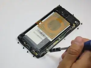 Возьмите отвертку Torx T5 и аккуратно выкрутите все винты на плате Droid Maxx. Обратите внимание, что всего имеется восемь (11) чёрных винтов, разбросанных по плате: четыре (4) в верхней части и четыре (4) в нижней, а также два (2) серебристых винта, расположенных в правой нижней части Droid Maxx.