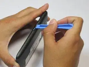 Свободной рукой возьмите лопатку и вставьте её между верхним зазором, ближайшим к экрану, кнопок громкости и корпуса Droid Maxx.