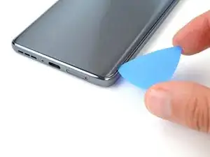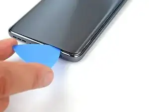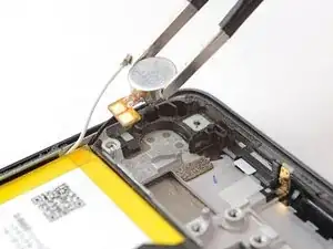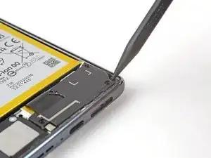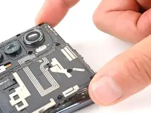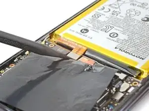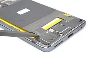 Вставьте лопатку под ленту, соединяющую катушку беспроводной зарядки и крышку платы-спутника в нижнем правом углу телефона.