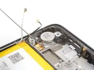 Используйте лопатку, чтобы отвести антенну вверх и в сторону от телефона, пока кабель не освободится из фиксатора на плате-спутнике.