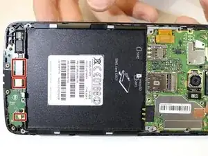 Снимите три разъёма на плате под аккумулятором, аккуратно потянув за небольшую золотую лапку пинцетом.